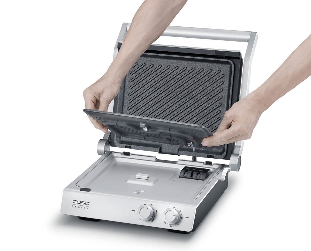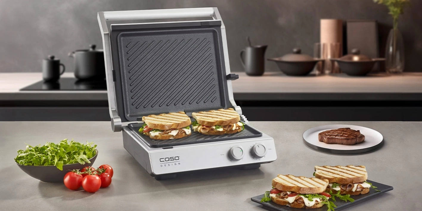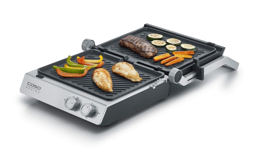 Rund 149 Euro, erhältlich direkt bei Caso oder im Fachhandel. Dafür bekommt man einen 2-in-1-Doppelkontaktgrill, der sich vollständig aufklappen und damit zur großen Tischgrillfläche verwandeln lässt. Das Konzept ist nicht neu. Die Ausführung aber hat Charakter.